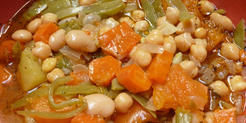- En una olla con agua incorporar los garbanzos y las bajocas o judías verdes, las patatas y la calabaza. Una vez listo añadir el sofrito, unas hebras de azafrán, los ajos y el comino picados en un mortero, un poco de hierbabuena seca y sal.